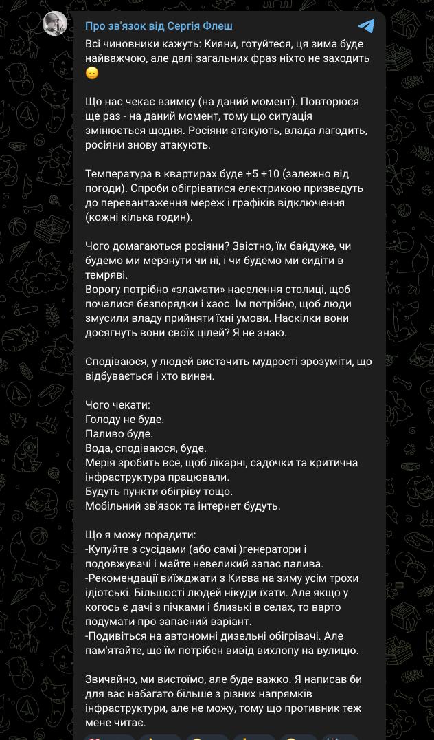 "Температура в квартирах будет +5…+10 (в зависимости от погоды). Попытки обогреваться электроэнергией приведут к перегрузке сетей и графикам отключений (каждые несколько часов)", - пишет он.