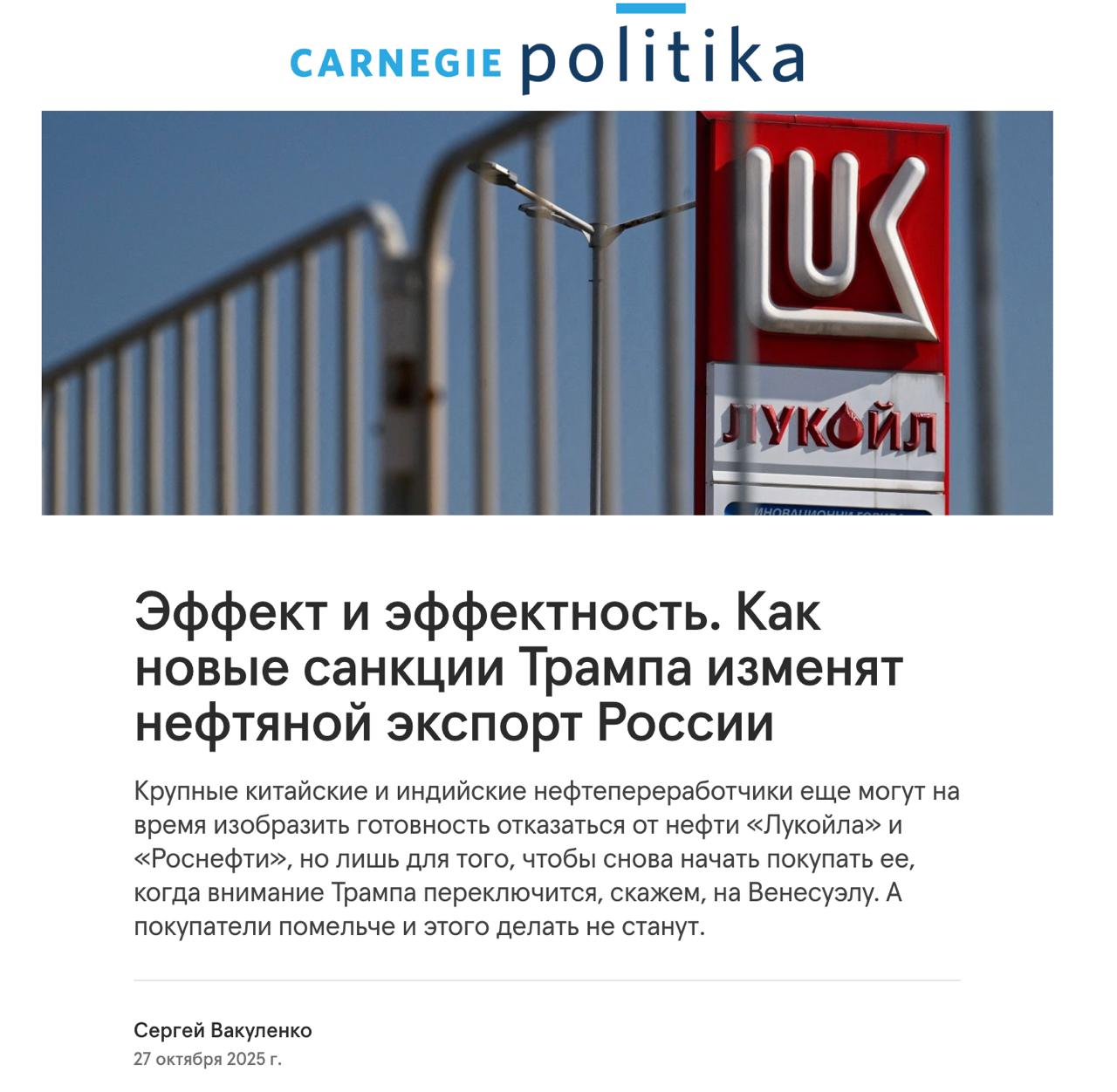 "Санкции наделали много шума — в основном потому, что они стали первыми, введенными после возвращения Дональда Трампа в Белый дом. В остальном же они несут немного нового: "Роснефть" и "Лукойл" теперь оказались примерно под такими же ограничениями, под какими еще с 10 января 2025 года находятся две другие крупные российские нефтяные компании — "Сургутнефтегаз" и "Газпром Нефть". Январские санкции, введенные уходящей администрацией Джо Байдена, тоже поначалу казались грозными. Но объемы добычи и экспорта у обеих компаний практически не снижались, а выросшие было накладные расходы и скидки при поставках в Индию и Китай вернулись к досанкционным значениям. Основные объемы экспорта пошли через компании-фронты, но обе компании достаточно часто отправляют нефтяные грузы и от своего имени. Поэтому пока нет серьезных оснований ожидать, что две следующие нефтяные компании не смогут справиться с той же задачей", - пишет Вакуленко.