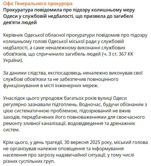 Прокуратура официально подтвердила, что бывший мэр Одессы Геннадий Труханов получил подозрение в служебной халатности, которая привела к гибели девяти человек во время недавнего потопа в городе.