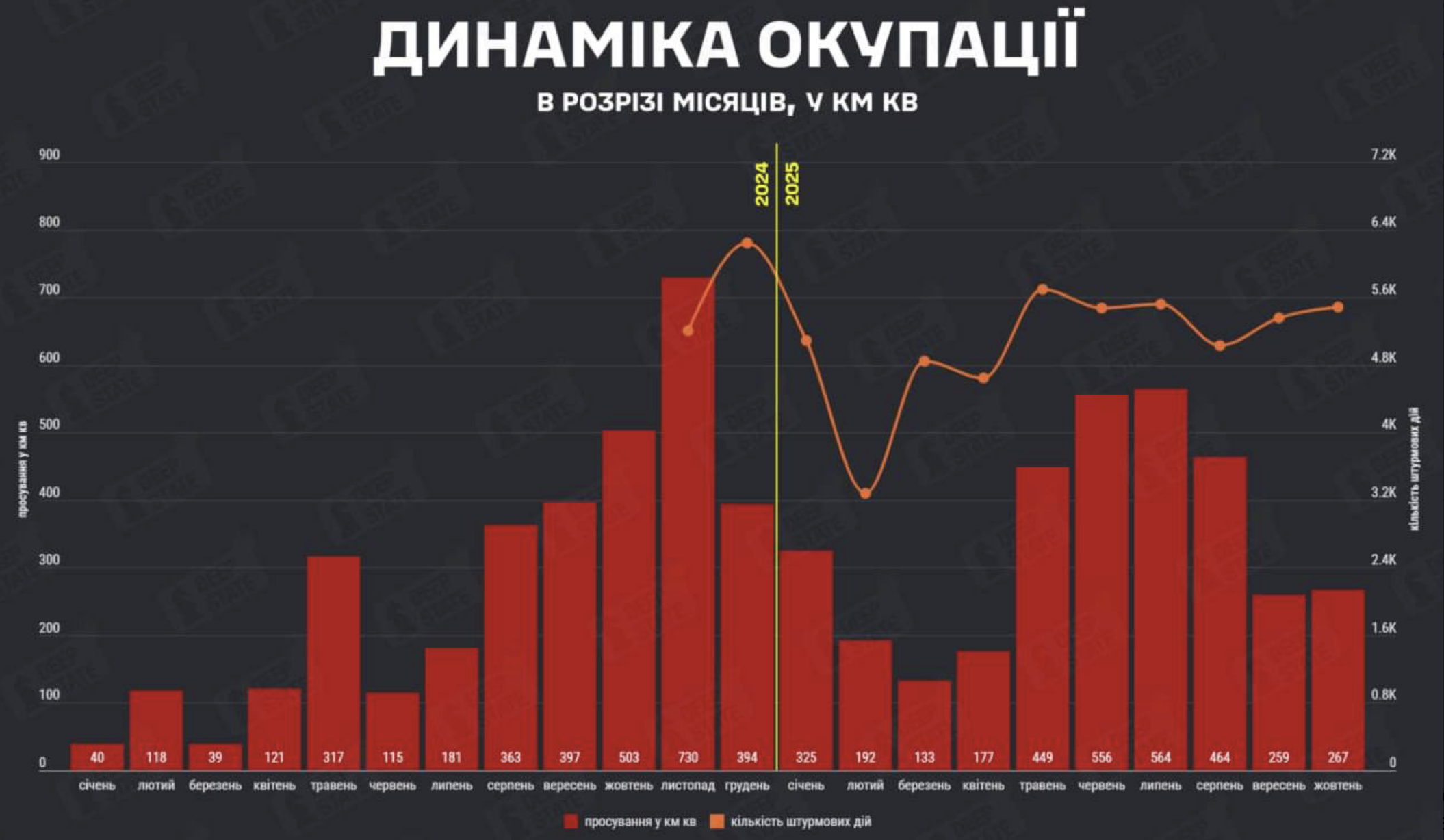 Об этом сообщает DeepState. В сентябре российские войска захватили 259 квадратных километров, а в октябре - 267.