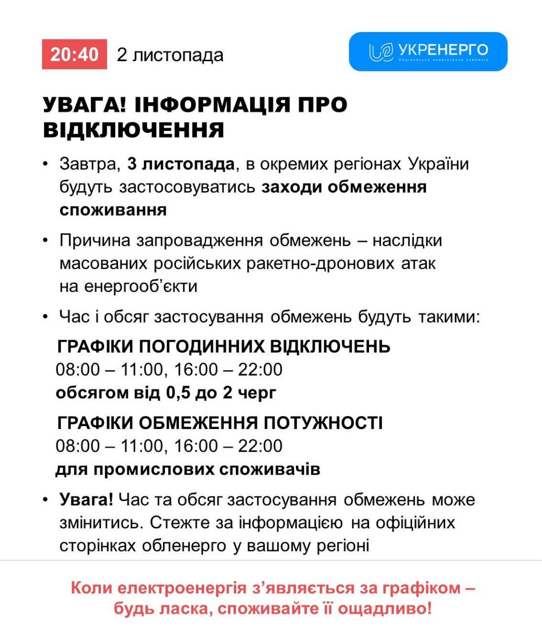 По данным "Укрэнерго", они запланированы с 8:00 до 11:00 и с 16:00 до 22:00.