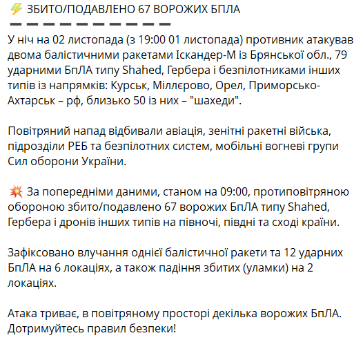 По данным военных, российская армия нанесла массированный удар, использовав 79 ударных дронов типов "Шахед", "Гербера" и других, а также две баллистические ракеты "Искандер-М".