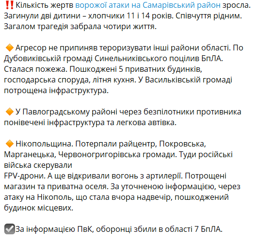 В Днепропетровской области в результате атаки погибли двое детей - 11 и 14 лет. Как сообщил и.о. главы областной государственной администрации Владислав Гайваненко, всего жертвами удара по Самаровскому району стали четыре человека.