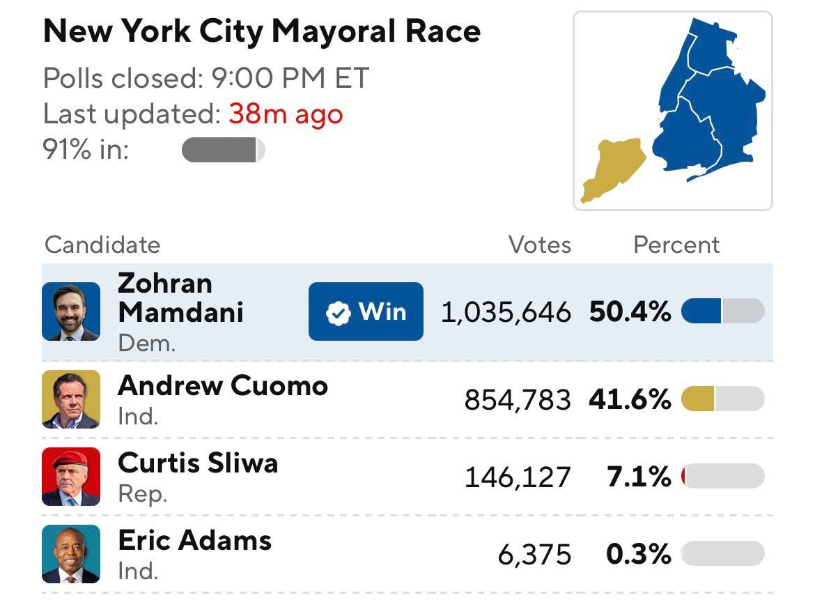 Мамдани набрал более 50% голосов и на 9% обошел своего главного соперника - бывшего губернатора штата Эндрю Куомо.