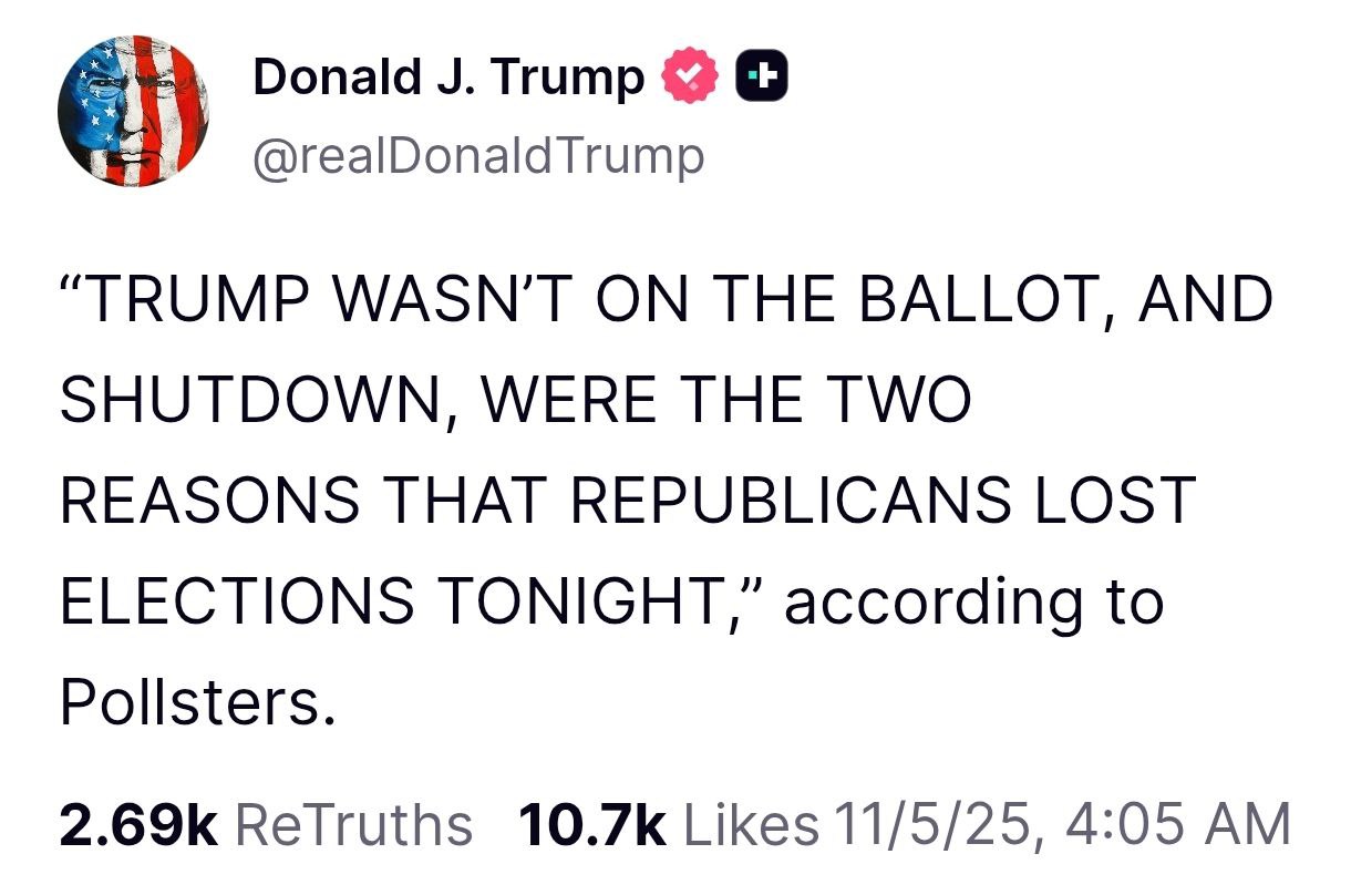 "Трампа не было в бюллетене, а также шатдаун - это и есть две причины, по которым республиканцы проиграли выборы сегодня вечером", - написал глава Белого дома в своей социальной сети Truth Social.