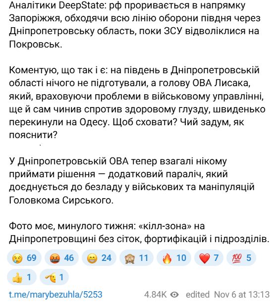 Об этом же рассказала в своих соцсетях и народный депутат Марьяна Безуглая. Она добавила, что на юге в Днепропетровской области ничего не подготовлено для обороны и регион лишен руководства.