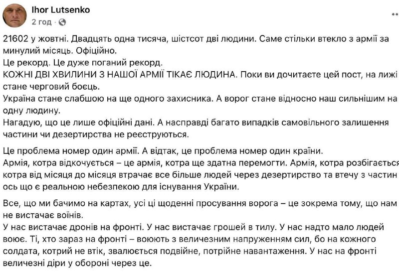 "Каждые две минуты из нашей армии бежит человек. Это только официальные данные. А на самом деле много случаев самовольного ухода из части или дезертирства не регистрируют. Это проблема номер один в армии. Откатывающаяся армия - это армия, которая еще способна победить. Разбегающаяся армия, которая от месяца к месяцу теряет все больше людей из-за дезертирства и бегства из частей, - вот это реальная опасность для существования Украины", - пишет Луценко.
