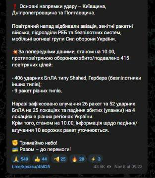 В ночь на 8 ноября армия РФ нанесла комбинированный удар по объектам критической инфраструктуры Украины с использованием ударных беспилотников и ракет воздушного, наземного и морского базирования.