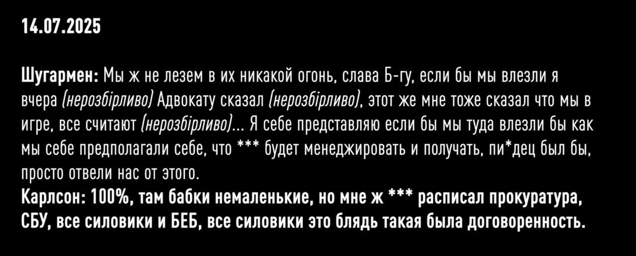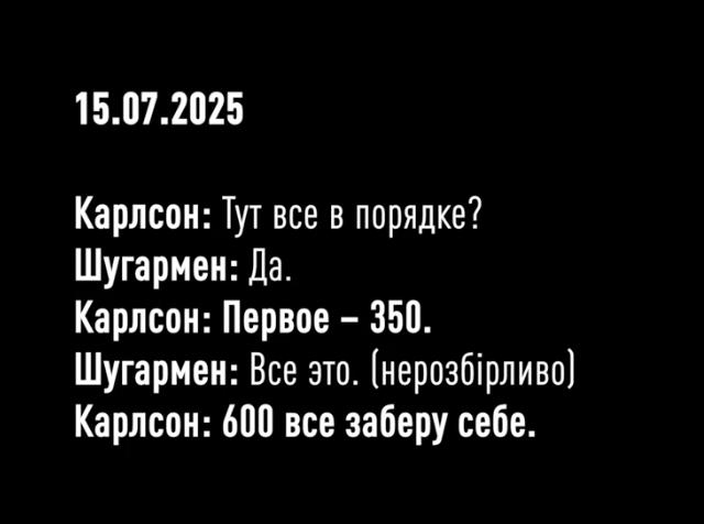 Еще на пленках Карлсон обсуждает с Шугарменом (предположительно, одним из братьев Цукерманов) необходимость поделить "немаленькие бабки" на "прокуратуру, СБУ, всех силовиков и БЭБ". Такую схему ему расписал некто, чье имя не раскрывается.