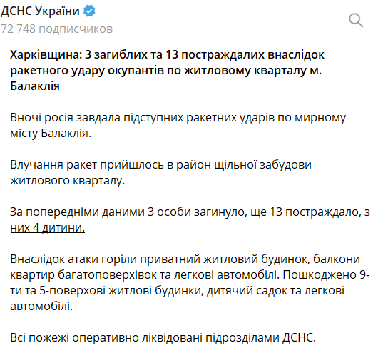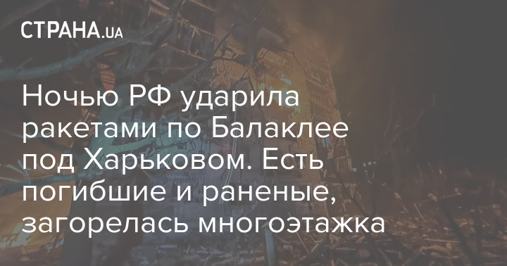 Ночью россияне нанесли ракетный удар по Балаклее в Харьковской области. Есть погибшие и раненые, повреждены жилые дома, произошло возгорание в многоэтажке.