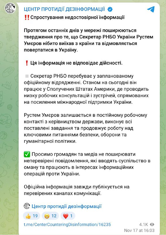 Вскоре после появления публикации Центр противодействия дезинформации при СНБО опроверг, что секретарь ведомства отказывается возвращаться в Украину. В центре заявили, что Умеров уже находится в США, где "проводит ряд рабочих консультаций и встреч, направленных на усиление международной поддержки Украины", "остается в постоянном рабочем контакте с руководством государства, выполняет все поставленные задачи и продолжает работу над ключевыми вопросами безопасности, обороны и гуманитарной политики".