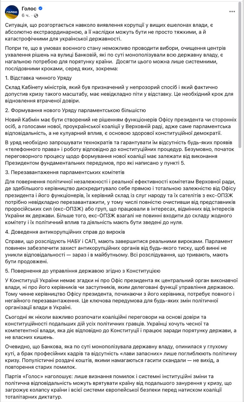 "Ситуация, разворачивающаяся вокруг выявления коррупции в высших эшелонах власти, является абсолютно экстраординарной, а ее последствия могут быть не просто тяжелыми, но и катастрофическими для украинской государственности. Несмотря на то что в условиях военного положения невозможно проводить выборы, очищение центров принятия решений на улице Банковой, которые, по сути, монополизировали всю государственную власть, является насущной необходимостью для спасения страны. В Конституции Украины нет упоминания ни об Офисе президента как центральном органе исполнительной власти, ни о его руководителях или заместителях, которым делегированы функции управления государством. Поэтому действующее руководство Офиса президента, начиная с его руководителя, нуждается в полной и немедленной перезагрузке. Это ключевая предпосылка любых изменений политической организации власти в Украине", - говорится в заявлении "Голоса".