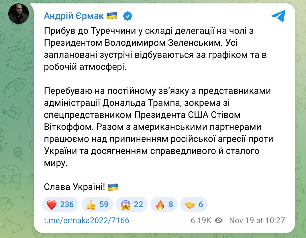 По словам Ермака, все запланированные встречи проходят по графику и в рабочей атмосфере. При этом он находится в постоянном контакте с Белым домом, в частности со специальным представителем главы Белого дома Стивеном Уиткоффом.