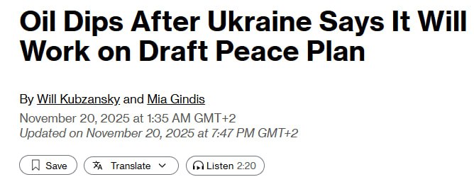 19.51 Зеленскому дали понять, что врученный ему мирный план поддерживает Трамп и что его надо принять, пишет Bloomberg.