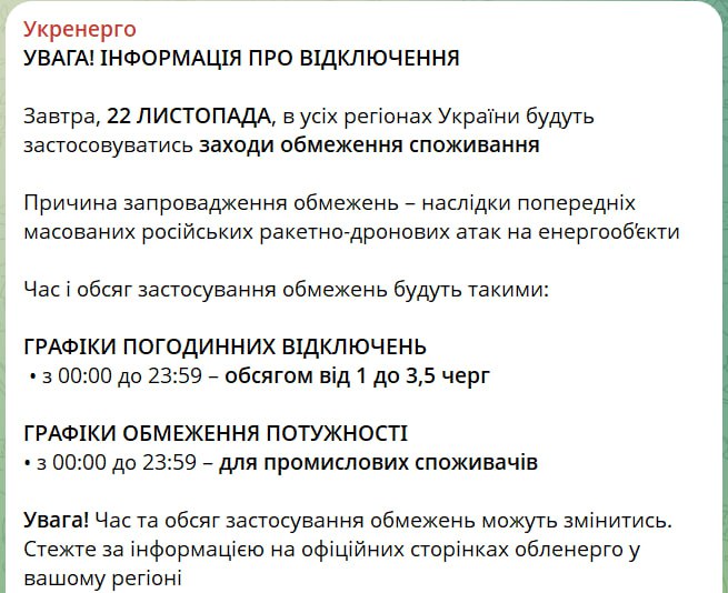 18:12 Отключения света завтра будут во всех регионах – круглосуточно в объеме от 1 до 3,5 очередей, сообщает Укрэнерго.