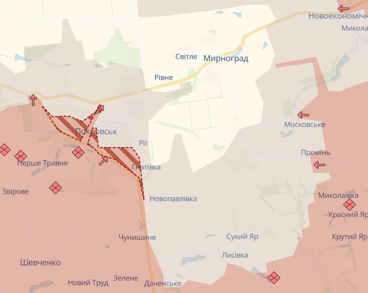 На карте военного телеграм-канал Deep State отображено существенное продвижение войск РФ в Покровске, но пока не полная его потеря.