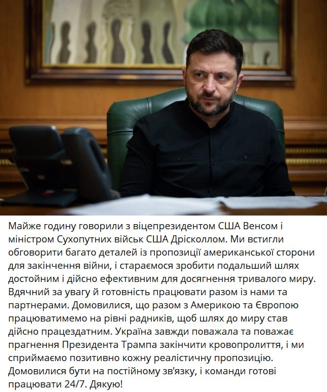 "Почти час разговаривали с вице-президентом США Вэнсом и министром Сухопутных войск США Дрисколлом. Мы успели обсудить многие детали предложения американской стороны по окончанию войны и стараемся сделать дальнейший путь достойным и действительно эффективным для достижения прочного мира. Благодарен за внимание и готовность работать вместе с нами и партнерами. Договорились, что вместе с Америкой и Европой будем работать на уровне советников, чтобы путь к миру стал действительно работоспособным. Украина всегда уважала и уважает стремление президента Трампа положить конец кровопролитию, и мы позитивно воспринимаем каждое реалистичное предложение. Договорились быть на постоянной связи, и команды готовы работать 24/7", - написал Зеленский.