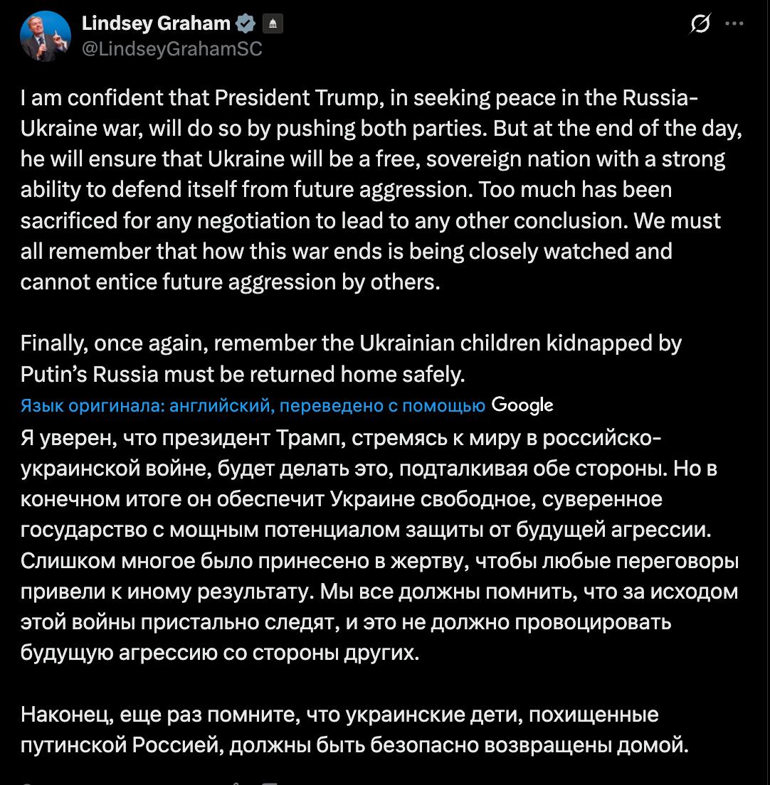 "Я уверен, что президент Трамп, стремясь к миру в российско-украинской войне, будет делать это, подталкивая обе стороны. Но в конечном итоге он обеспечит Украине свободное, суверенное государство с мощным потенциалом защиты от будущей агрессии", - написал Грэм.