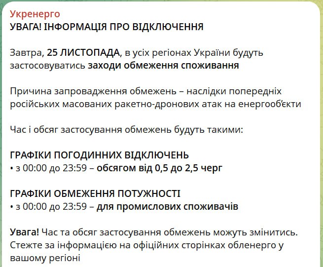 18:05 Отключения света завтра будут во всех регионах – круглосуточно в объеме от 0,5 до 2,5 очередей, сообщает Укрэнерго.