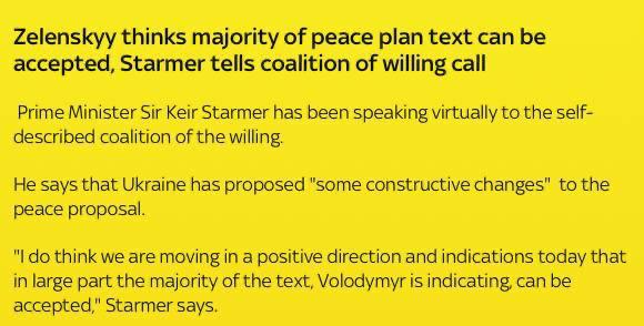 Кроме того, британский премьер заявил, что Зеленский считает, что бо́льшая часть мирного плана США может быть принята.
