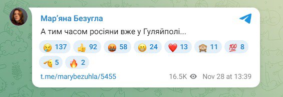 Безуглая заявила, что российские войска вошли в Гуляйполе