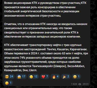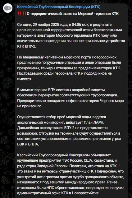 Сегодня ночью во время атаки беспилотных катеров был уничтожен причал для погрузки нефти в Новороссийске, принадлежащий Каспийскому трубопороводному консорциуму (КТК). Он обеспечивает 80% экспорта казахстанской нефти.