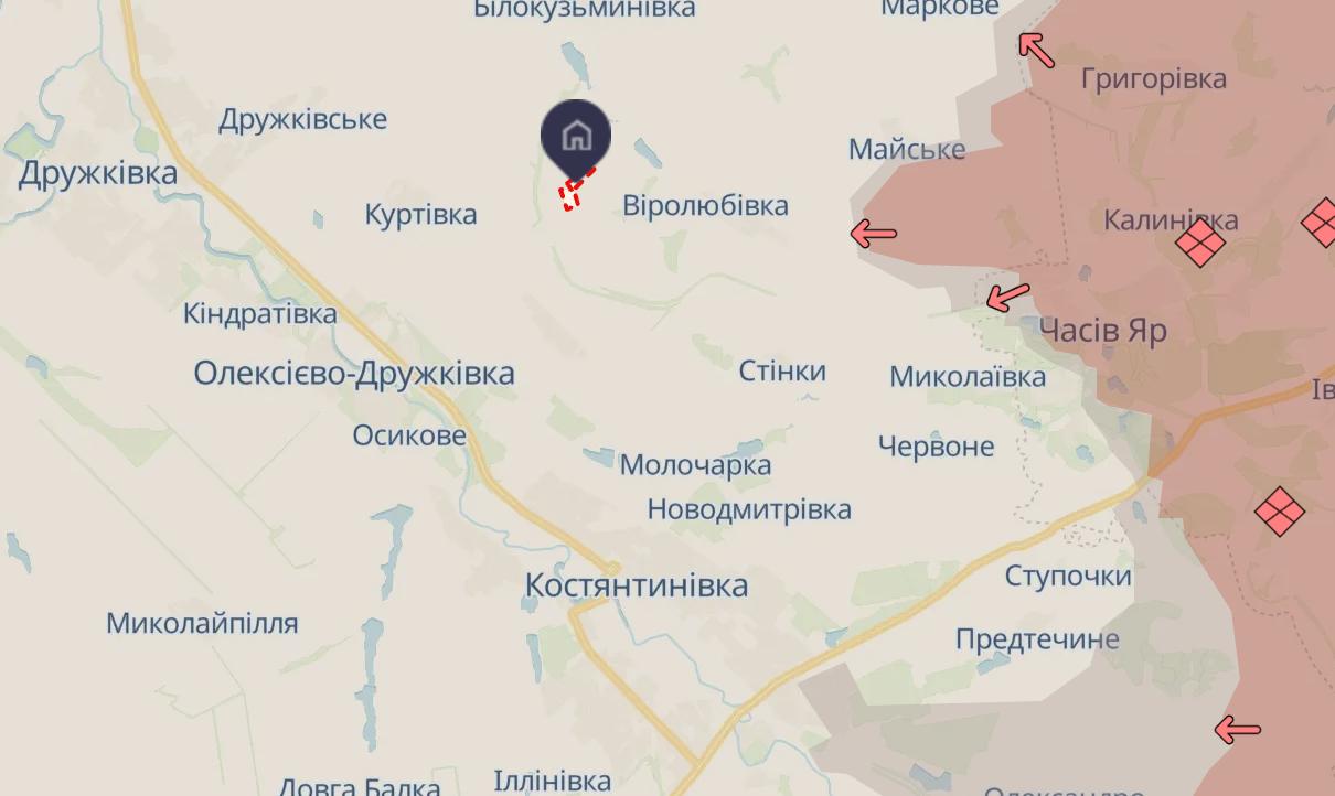 По карте Deep State этот населенный пункт находится в 7 км от линии фронта и в 7 км от Дружковки. Других свидетельств потери Клинового нет.
