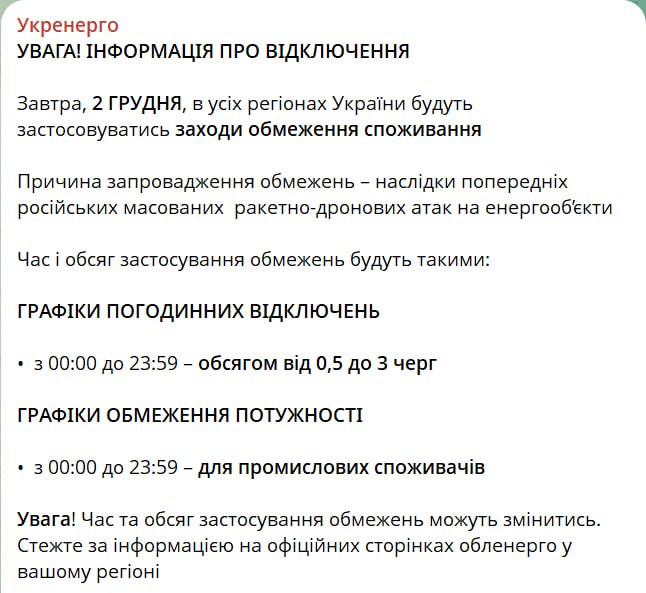 18.39 Отключения света завтра будут во всех регионах – круглосуточно в объеме от 0,5 до 3 очередей, сообщает "Укрэнерго".
