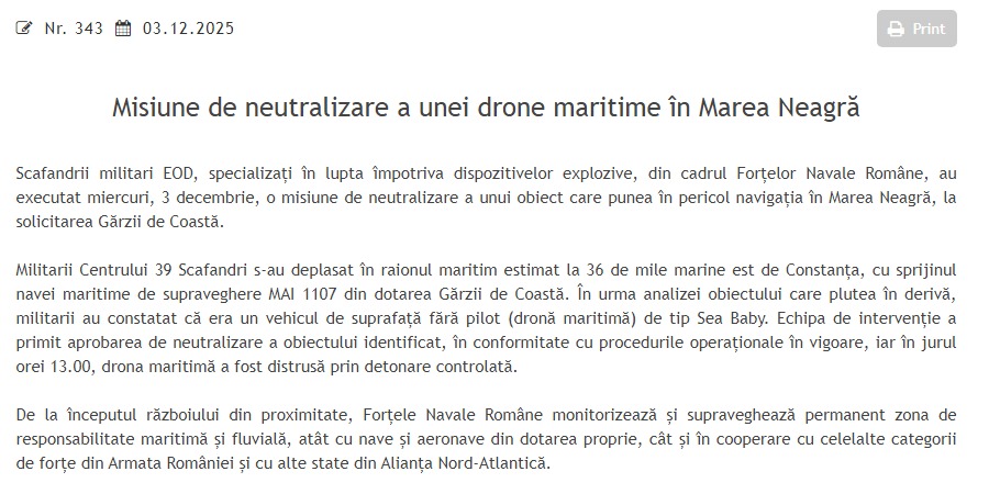 "Военнослужащие 39-го водолазного центра выдвинулись в район, расположенный примерно в 36 морских милях к востоку от Констанцы, при поддержке судна морского наблюдения MAI 1107 Береговой охраны. После анализа дрейфующего объекта военнослужащие установили, что это беспилотный надводный аппарат (морской беспилотник) типа Sea Baby. Группа реагирования получила разрешение на нейтрализацию выявленного объекта в соответствии с действующими оперативными процедурами, и около 13:00 морской беспилотник был уничтожен путем контролируемого подрыва", - сказано в публикации.