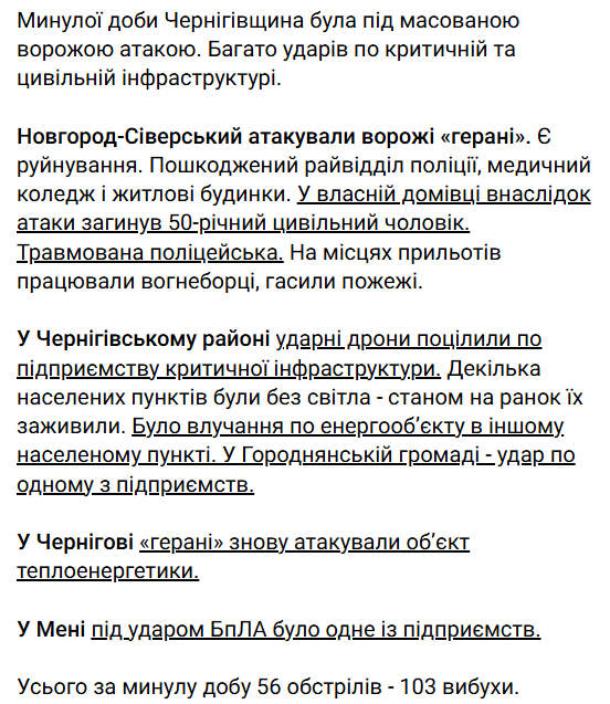 В Черниговском районе беспилотники попали по предприятию критической инфраструктуры. Часть населённых пунктов осталась без электроснабжения, однако к утру энергетики восстановили его. Отдельно зафиксировано попадание по энергообъекту в другом населенном пункте района.