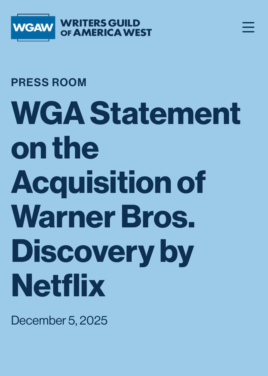 "Антимонопольное законодательство призвано предотвратить поглощение крупнейшей в мире стриминговой компанией одного из своих крупнейших конкурентов. Это приведёт к сокращению рабочих мест, снижению заработной платы, ухудшению условий труда всех работников индустрии развлечений, повышению цен для потребителей и сокращению объёма и разнообразия контента для всех зрителей. Работники индустрии, как и общественность, уже страдают от того, что лишь несколько влиятельных компаний сохраняют жёсткий контроль над тем, что потребители могут смотреть по телевизору, на стриминговых сервисах и в кинотеатрах. Это слияние необходимо предотвратить", – сказано в заявлении WGA.