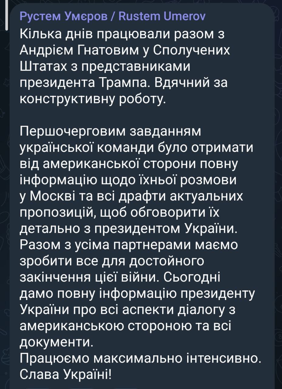 "Несколько дней работали вместе с Андреем Гнатовым (начальником Генерального штаба ВСУ - Ред.) в Соединённых Штатах с представителями президента Трампа. Благодарен за конструктивную работу", - заявил Умеров.