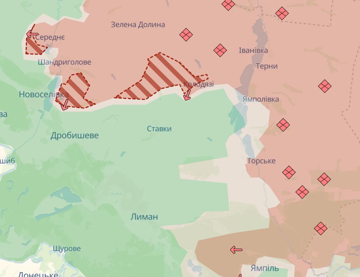 Армия РФ продвинулась на трех участках севернее Лимана - в районе Среднего, Дерилового и Колодязей, сообщает Deep State.