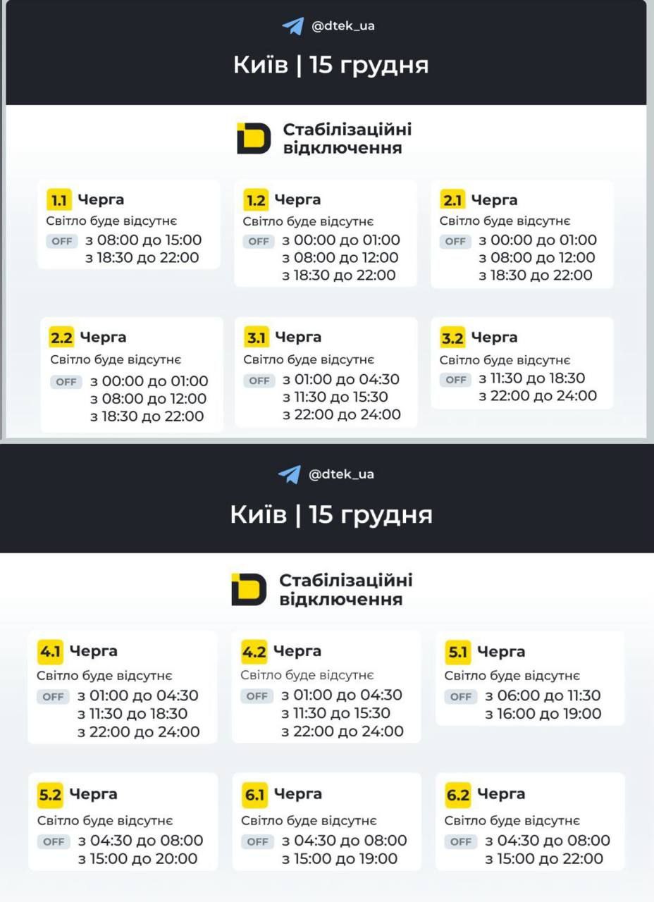 Судя по опубликованному графику ДТЭК на 15 декабря, в зависимости от очереди суммарное время отключений колеблется примерно от 11 до 16 часов.