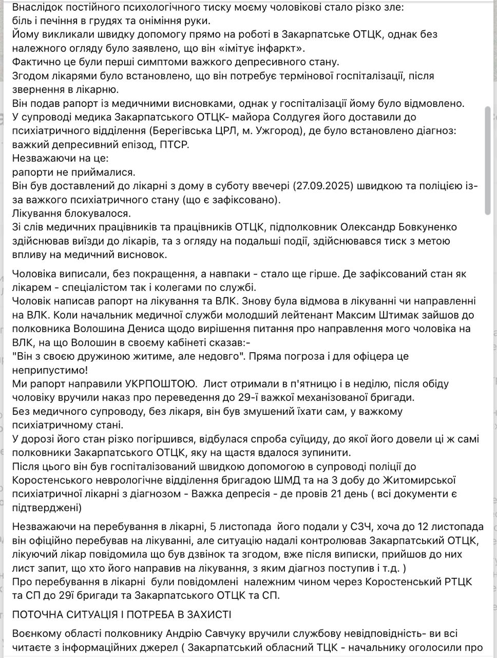 "В начале его вызвал к себе полковник Денис Волошин - первый заместитель Закарпатского ОТЦК и СП, где сказал фразу: "Передай жене: пусть удалит публикацию или изменит её! Стоят машины, и они иногда взрываются!" После этого моего мужа вызвали в кабинет полковника Савчука и у него отобрали телефон и угрожали. Полковник Андрей Савчук лично, в присутствии подполковника Александра Бовкуненко и подполковника Геннадия Белого, заявлял, что примет меры в отношении меня и моего мужа, если ещё раз такое повторится" - написала Рейпаши.