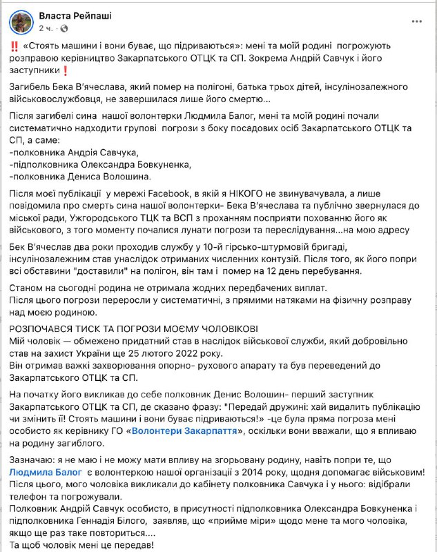 Закарпатская волонтер Власта Рейпаши заявила, что руководство областного ТЦК и СП угрожают ей лично и её семье убийством из-за публикации в сентябре сообщения о смерти на полигоне мобилизованного Вячеслава Бека, инсулинозависимого отца троих детей.