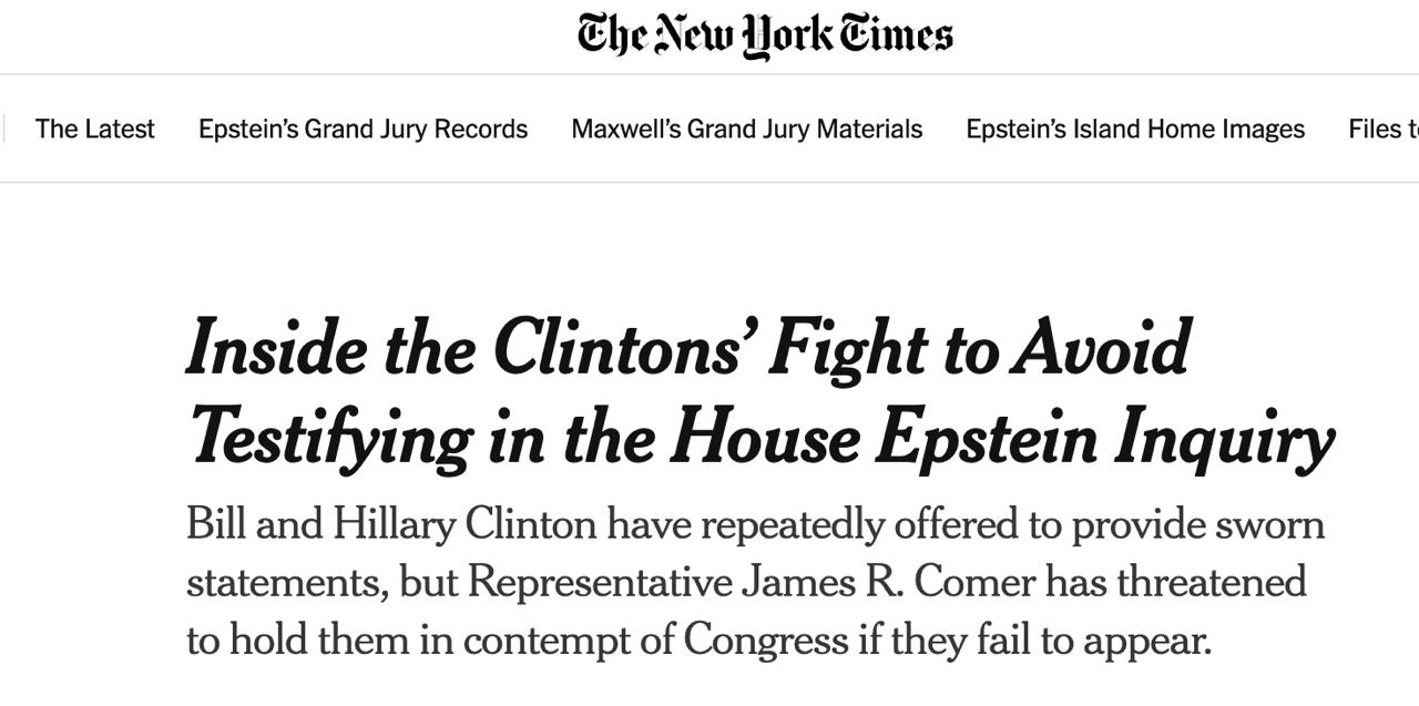 По информации издания, председатель комитета алаты представителей по надзору Джеймс Р. Комер из Кентукки уже несколько месяцев требует от бывшего президента и госсекретаря лично явиться в конгресс для показаний по делу сексуального преступника, но они соглашаются только предоставить письменное заявление под присягой.