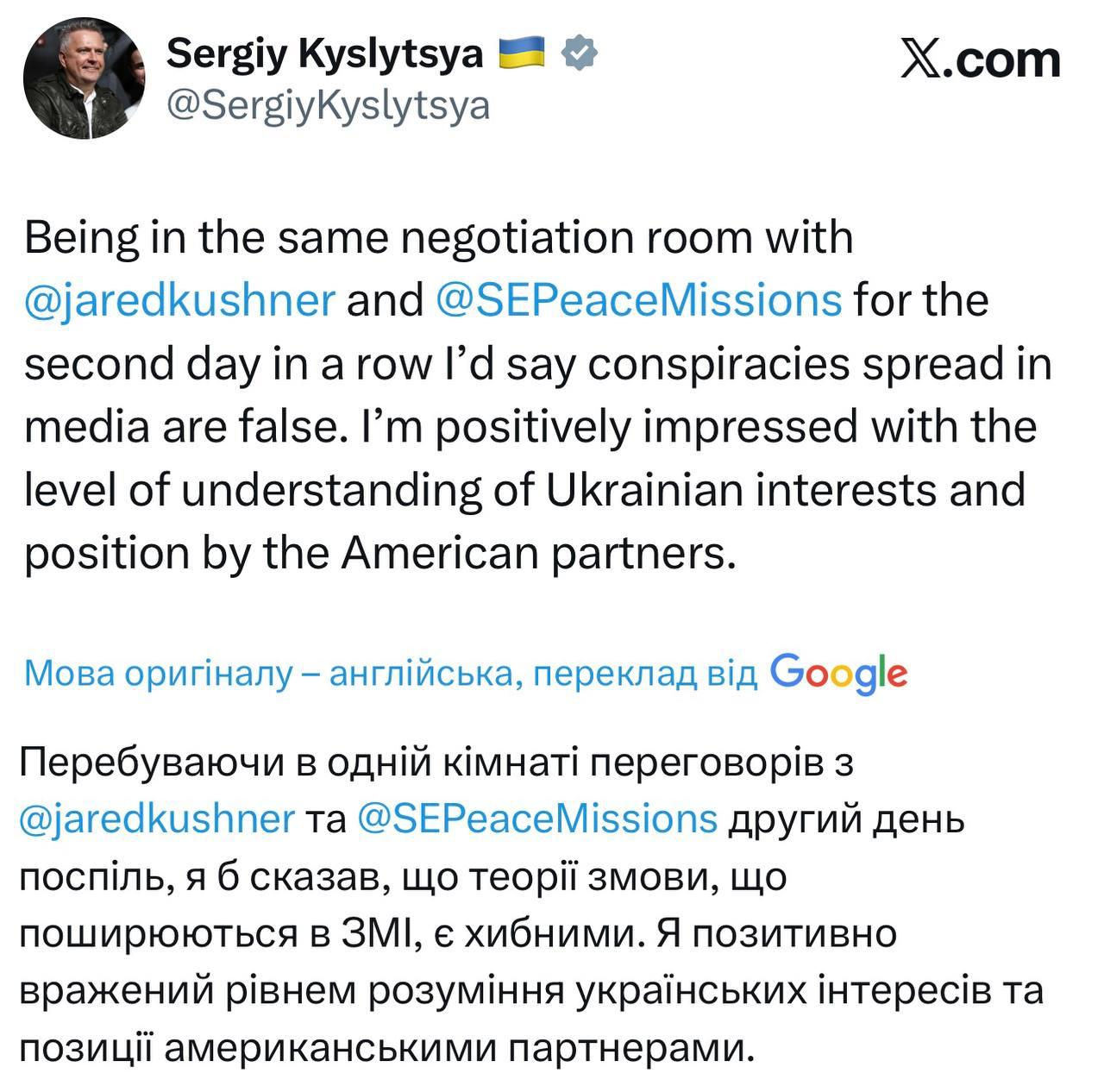 "Находясь в одной переговорной комнате с Кушнером и Уиткоффом второй день подряд, я бы сказал, что распространяемые в СМИ теории заговора ложны. Я положительно впечатлен уровнем понимания интересов Украины и позиции американских партнеров. Важно, чтобы американская сторона оставалась полностью вовлеченной в мирный процесс и пыталась определить шаги, которые могут привести к справедливому и устойчивому прекращению войны. Несправедливо искажать подход американской команды, в то время как они вкладывают время, усилия и ресурсы в установление мира. Каждая команда внимательно слушает друг друга. Позиция Украины очень ясна. Анонимные источники неверны", - заявил Кислица.