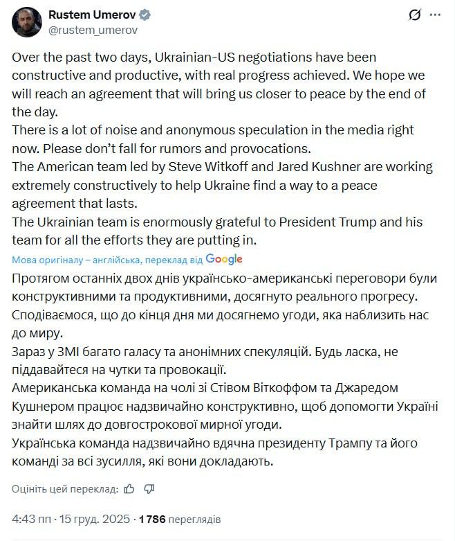 "За последние два дня украинско-американские переговоры были конструктивными и продуктивными, достигнут реальный прогресс. Мы надеемся, что к концу дня мы достигнем соглашения, которое приблизит нас к миру", - пишет глава переговорной делегации.