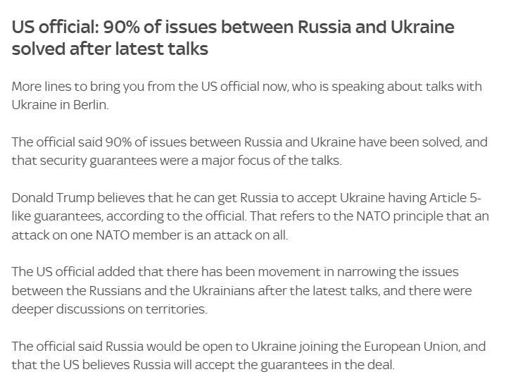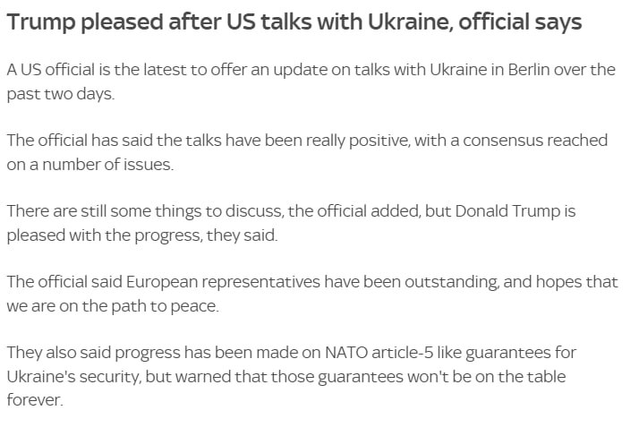 По словам чиновника, президент США Дональд Трамп считает, что сможет убедить Россию принять гарантии, аналогичные статье 5, предоставляемые Украине. Чиновник также сказал, что в Берлине был достигнут прогресс по данному пункту, но предупредил, что эти гарантии не будут находиться на столе вечно.