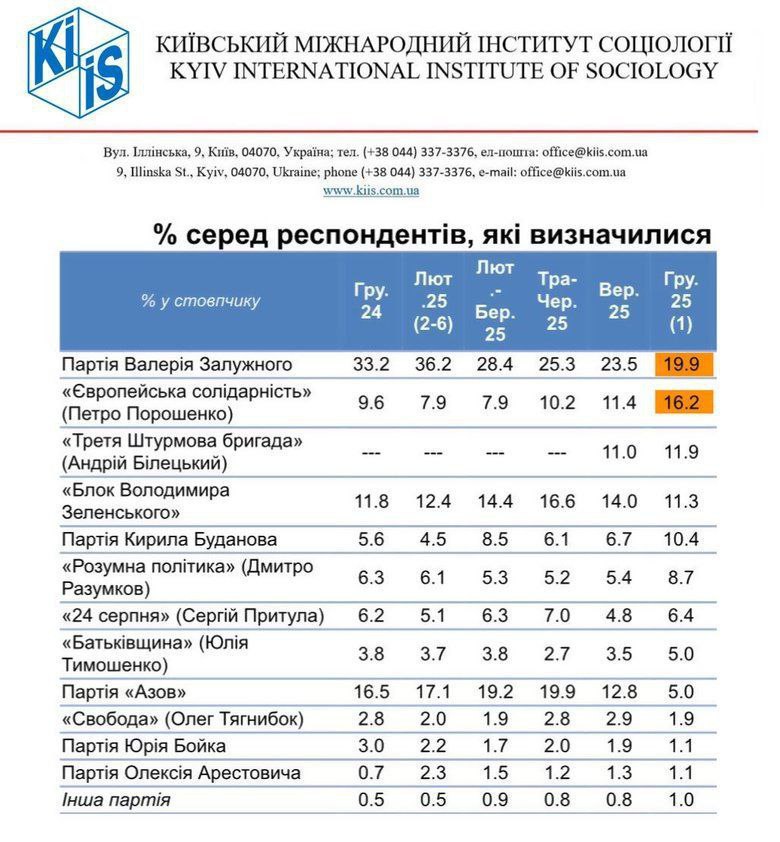 Согласно его данным, 19,9% определившихся граждан отдали бы голос за условную партию экс-главкома ВСУ и действующего посла Украины в Великобритании Валерия Залужного. На втором месте - партия "Евросолидарность" Петра Порошенко (16,2%), а замыкает топ-3 гипотетическая партия командира Третьего корпуса Андрея Билецкого "Третья штурмовая бригада" – 11,9%.