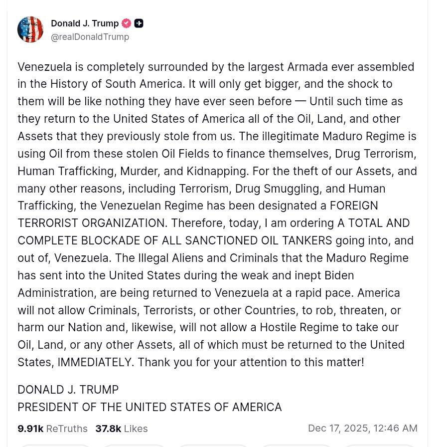 Президент США сообщил, что отдал приказ о "полной и полной блокаде всех нефтяных танкеров, входящих в Венесуэлу и выходящих из нее".