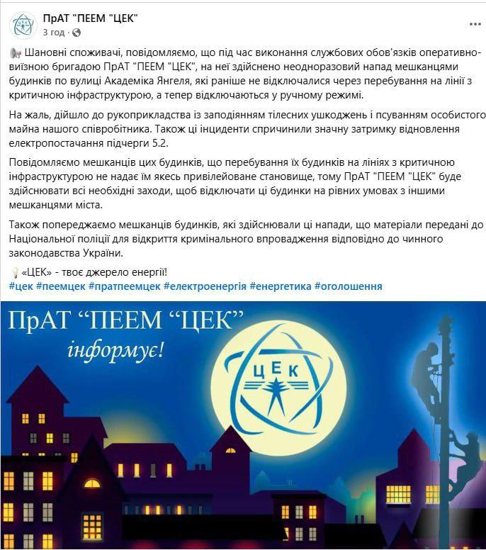 В этих домах по улице Академика Янгеля раньше всегда был свет, потому что они находятся на одной линии с критически важным объектом. Теперь их стали отключать в ручном режиме. что спровоцировало драки с порчей имущества. Из-за этих драк не удаётся вовремя включать другую очередь. Дело передано в полицию.