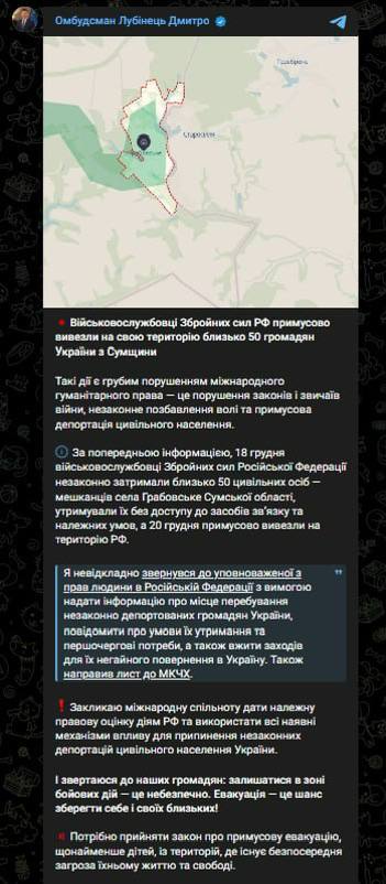 По его словам, после пересечения границы российские военные задержали около 50 местных жителей, удерживали их без доступа к средствам связи и надлежащих условий, а затем принудительно вывезли на территорию России.