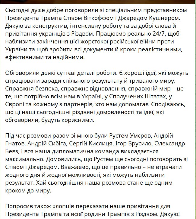 "Обсудили некоторые значительные детали работы. Есть хорошие идеи, которые могут сработать ради совместного результата и продолжительного мира. Настоящая безопасность, настоящее восстановление, настоящий мир - это то, что нужно всем нам в Украине, Соединенных Штатах, Европе и каждому из партнеров, кто нам помогает", - говорится в сообщении.