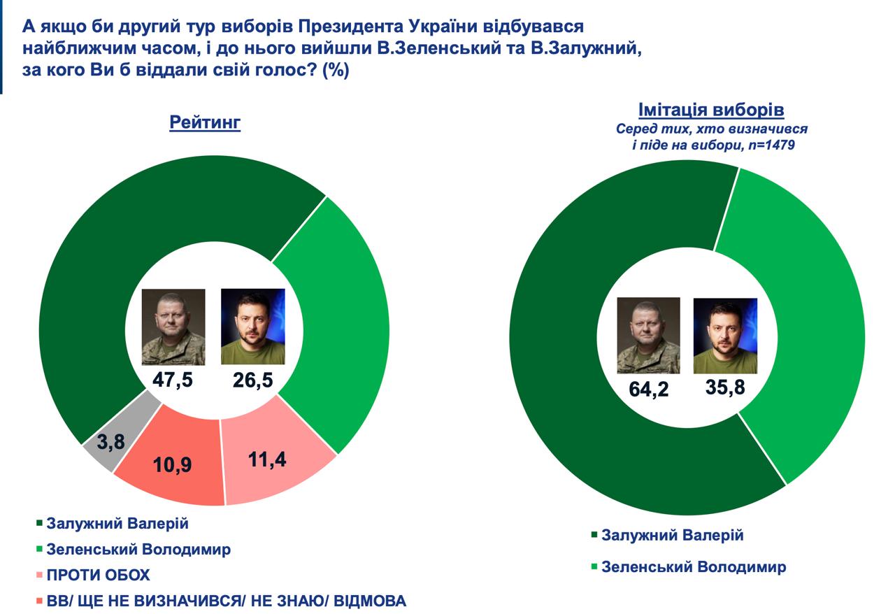 В случае выхода во второй тур действующего президента и экс-главкома, Залужный набрал бы 64,2%, а Зеленский 35,8%. В случае с главой ГУР разрыв меньше, но все равно существенный - 56,2% против 43,8%.
