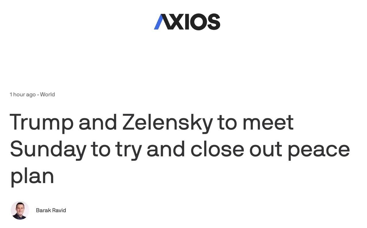 Инсайд Axios подтвердил Зеленский, заявив, что его встреча с Трампом нужна для согласования спорных 10% в проекте мирного плана, в частности вопросов гарантий безопасности, территорий и послевоенного восстановления Украины. По словам президента, остальные 90% уже согласованы на уровне делегаций.