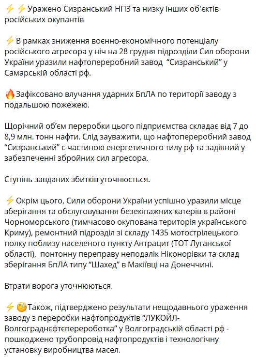 В ночь на 28 декабря Силы обороны Украины поразили Сызранский нефтеперерабатывающий завод в Самарской области РФ.