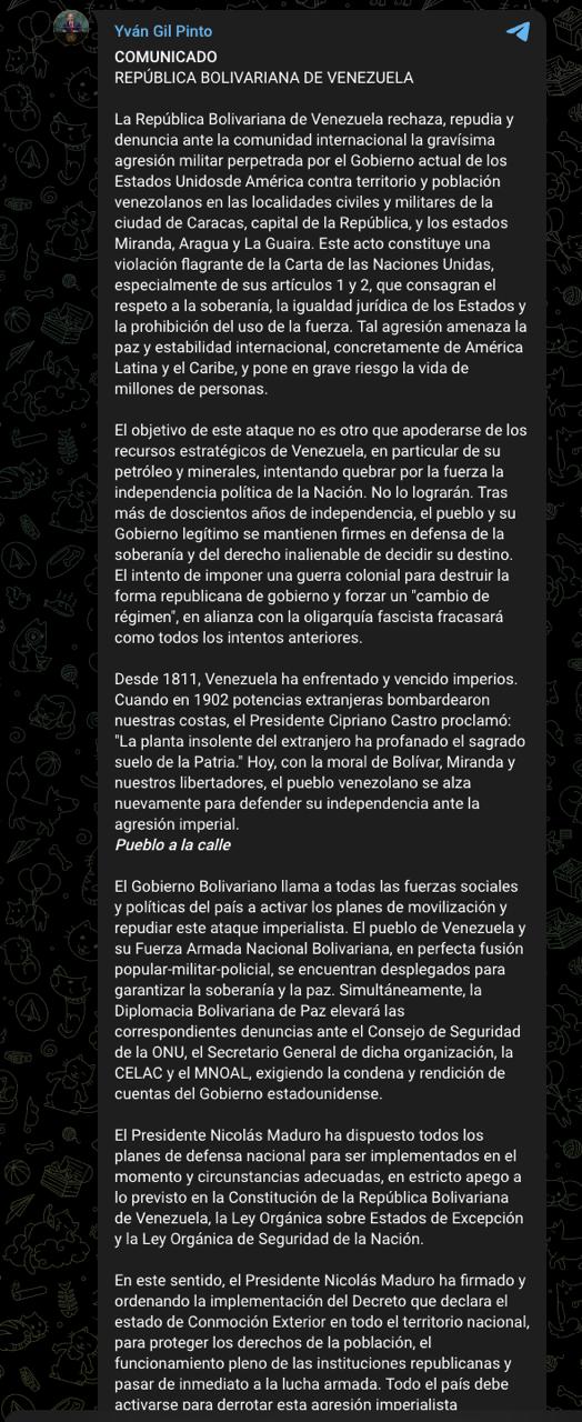 "Сегодня утром, 3 января, венесуэльский народ подвергся преступной военной агрессии со стороны правительства США. Честь, долг и история зовут нас. Пусть крик свободной Родины раздастся в каждом уголке! Победа наша, потому что нас сопровождают разум и достоинство! Мы победим!", - заявил Лопес.