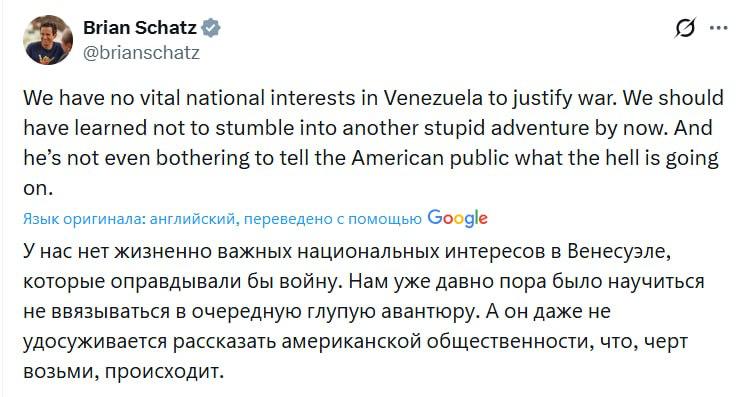"У нас нет жизненно важных национальных интересов в Венесуэле, которые оправдывали бы войну. Нам уже давно пора было научиться не ввязываться в очередную глупую авантюру. И он даже не утруждается рассказать американской общественности, что, черт возьми, происходит", - написал Шац.